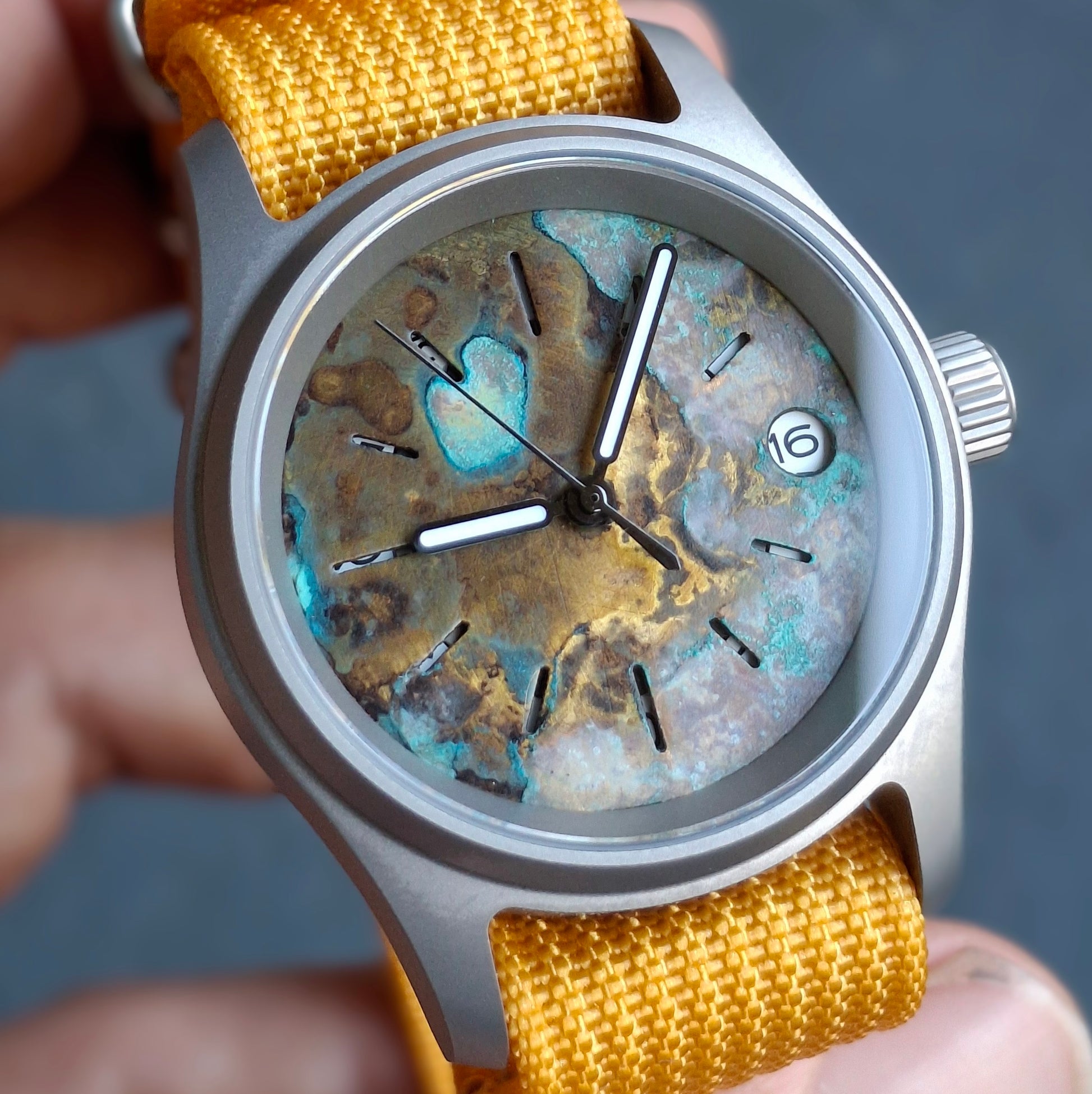 We're testing a small batch of titanium cases, in very limited numbers of both 36mm and 39mm. The specs are the same: sapphire crystal, screw down crown and caseback with 100m depth rating. These have a blasted finish and the warm grey tone associated with titanium. The big difference is that they are about half the weight of the stainless steel cases, a noticeable difference for a watch designed to be worn every day.